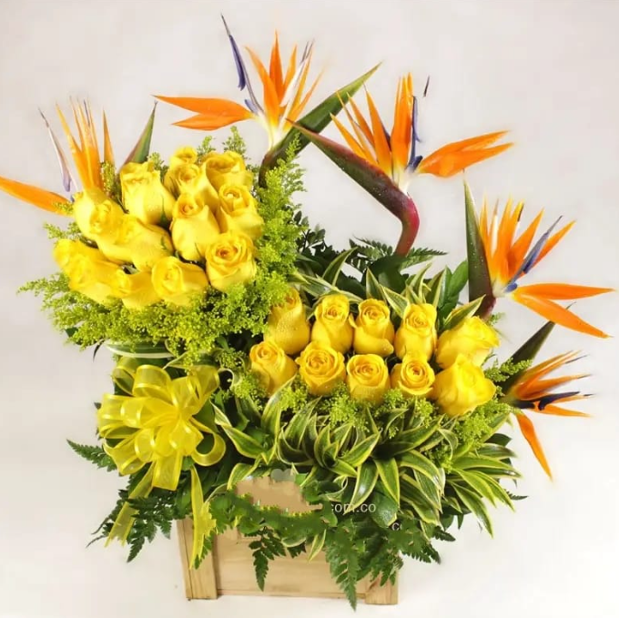 Un diseño radiante que combina flores frescas con elementos naturales, inspirado en la energía del sol. Perfecto para transmitir vitalidad, luz y frescura, ideal para alegrar cualquier espacio y celebrar la vida.
