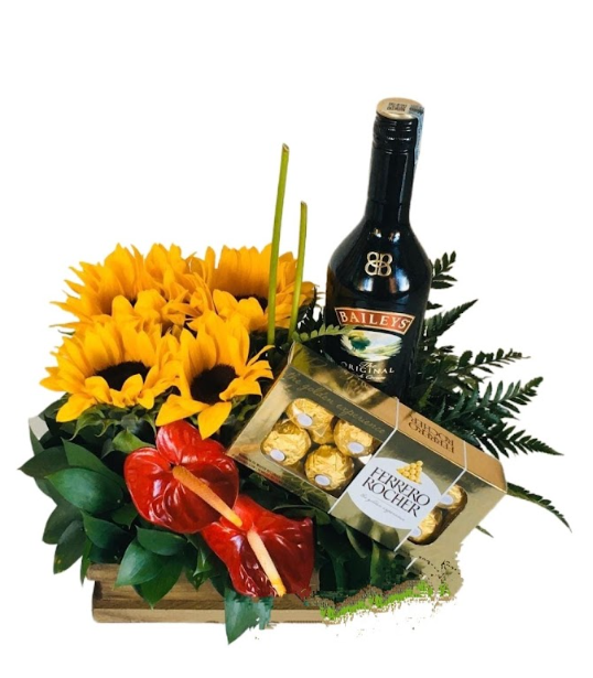 Un arreglo sofisticado que combina la suavidad de flores frescas, la dulzura de chocolates finos y el toque único de Baileys.