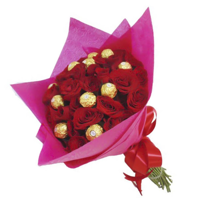 Una combinación irresistible de rosas frescas y chocolates Ferrero Rocher. El regalo perfecto para sorprender con elegancia, dulzura y mucho amor.