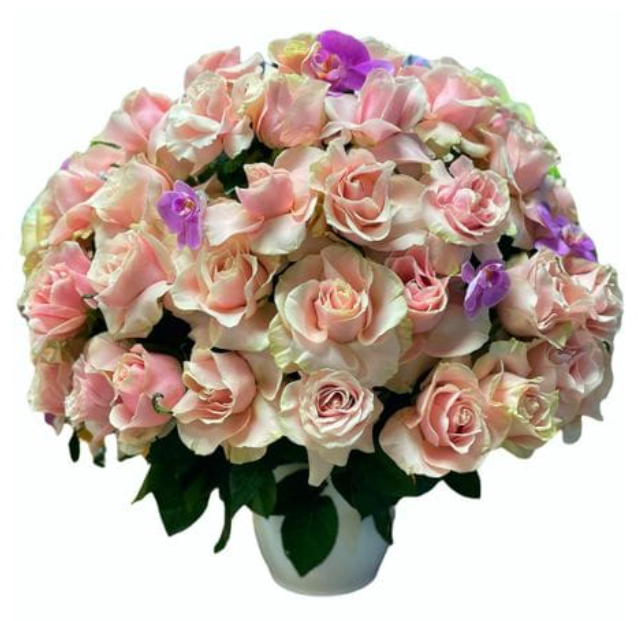 Una maceta sofisticada que combina la belleza clásica de las rosas con la exótica gracia de las orquídeas. Un detalle ideal para añadir un toque de distinción y frescura a cualquier espacio.